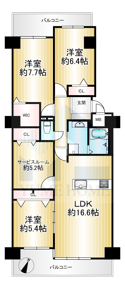 また、居室としても利用可能な約5.2帖のサービスルーム(納戸)があり収納充実!