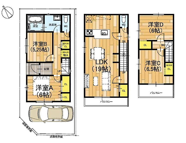 ◆建物面積 105.36㎡、木造3階建て、4LDKの間取り