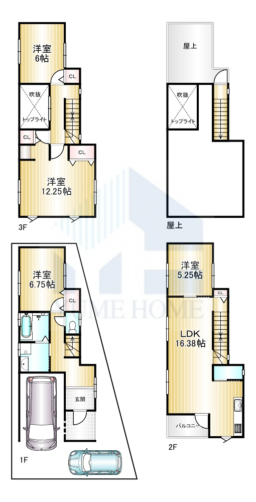 ◆建物面積 122.75㎡、木造3階建て、4LDKの間取り